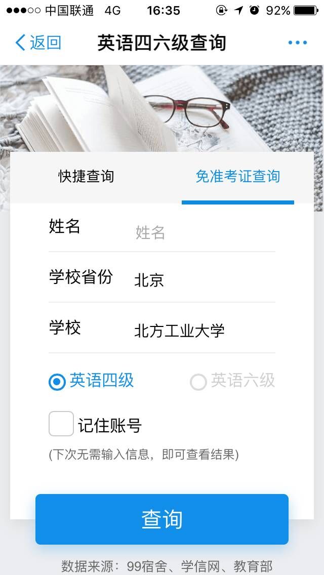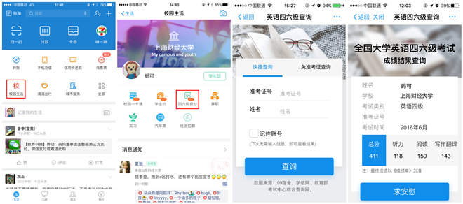 大学英语四六级考试是很多人大学生涯中必不可少的一次考试,但是,四六级考试的查询一直没那么简单。一方面,纸质成绩单的发放速度比较慢,一般情况下,考生需要在成绩公布后很长一段时间后才能拿到;另一方面,通过网络查询四六级考试的程序比较繁琐,在大部分查询网站都需要出示准考证号,由于号码较长、准考证时常丢失等原因,查询四六级成绩成了让考生头疼的一件事儿。