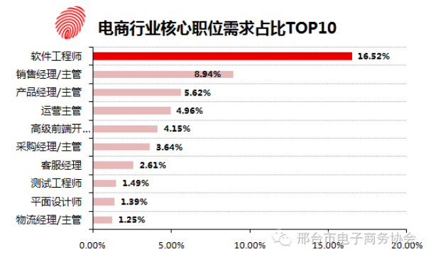 在电商行业核心职能需求占比前十中,大部分的职位都是互联网技术岗位,其中,软件工程师以16.52%的占比遥遥领先,由此可见,电子商务与互联网特质密切相关,沃锐调研中心数据分析师表示,随着电商交易的频度增高,任何电商平台无论是售前还是售后都需要对客服流程体系支持,为消费者排忧解难,提高品牌忠诚度。维持工作的顺利运作,除了技术人才,还少不了物流的及时配合,对消费者而言物流也是一次服务体验,从某种程度上,物流也是电商的生命线。