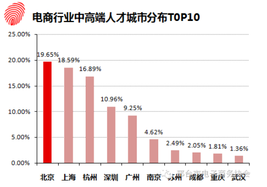 数据显示,在电商行业中高端人才城市分布前10名中,北京、上海、杭州、深圳、广州毫无悬念的位居前五名。此外,在这些排名前10的城市中,有7个是经国务院批准设有跨境电子商务综合试验区的城市,包括,上海、杭州、深圳、广州、苏州、成都、重庆。对此,沃锐调研中心数据分析师表示,这些城市之所以可以挤进前十,一方面是得益于本身地理、经济的优势,另一方面是受惠于国家政策对跨界电商的重视与支持。对于有志于从事电商的人才,并不一定要跻身一线城市,表现优异的二线城市,也是不错的选择。