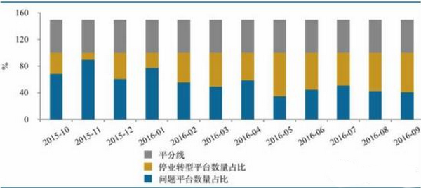 截至2016年9月底,累计停业及问题平台达到了2076家,9月单月停业及问题平台达98家。随着《暂行办法》的推出,停业转型数量要明显多于问题平台数量,其中问题平台40家(跑路32家、提现困难8家),占比40.8%;停业平台58家(停业57家、转型1家),占比59.18%。