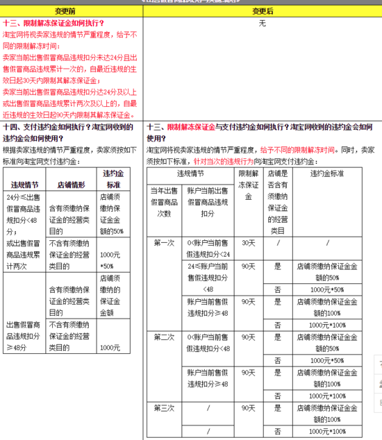 优化了“限制解冻保证金与支付违约金”执行细则。针对卖家当次的违规行为,必须按照规定标准,向淘宝网支付保证金。其中: