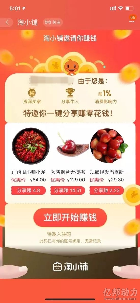 亿邦动力了解到,用户必须有邀请码才可开通淘小铺,用户下载淘小铺成为掌柜后,可自行选择商品上架,销售商品后即可获得相应比例的收益。淘小铺官方将此举措定义为“一键创业”。