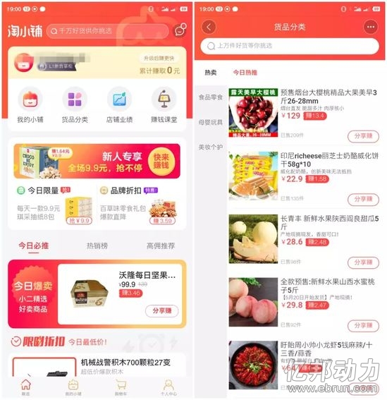 用户注册淘小铺后可发现,其App首页包含“今日限量”、“品牌折扣”、“今日爆卖”、“限时折扣”和“热销榜”等板块,还可在首页直接查看货品分类和店铺业绩等。目前淘小铺主要覆盖的品类包括食品、母婴、美妆、服饰等。